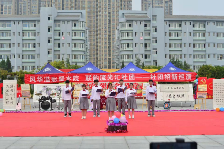 百团齐演聚满园, 水院学子展风采。为了进一步丰富学生社团文化生活,促进社团健康发展,展现我校青年学生朝气蓬勃的良好精神面貌。由校团委主办,社团联合会承办的社团招新巡演活动于10月23日——10月31日在扬帆广场举行。
