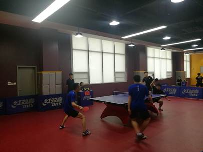 我校选手参加男子双打比赛(右侧穿黑衣者)