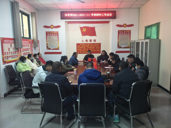 2022年2月18日上午10点,体育部于部门办公室召开了本学期的期初工作会议,会议由体育部直属党支部书记、主任刘盎主持,全体教职工参会。会上,刘盎主任首先传达了学校期初工作会议的主要精神和内容,并将本部门上学期的工作内容、成绩、进度做了简单总结,传达了本学期的重点工作安排,提出了需要继续发扬的优点,同时也点出了需要继续努力的短板。之后,由蔡寄平主任根据学校期初教学工作会议的内容,对部门期初教学工作检查、教学活动安排等相关要求进行了传达,希望全体教职工按照时间节点,提前部署安排。最后,刘盎主任对部门新学期的工作提出期望,希望全体教职工能够齐心协力,扎实推进“规定动作”,积极开展工作创新,尽己所能助力学校的建设与发展。