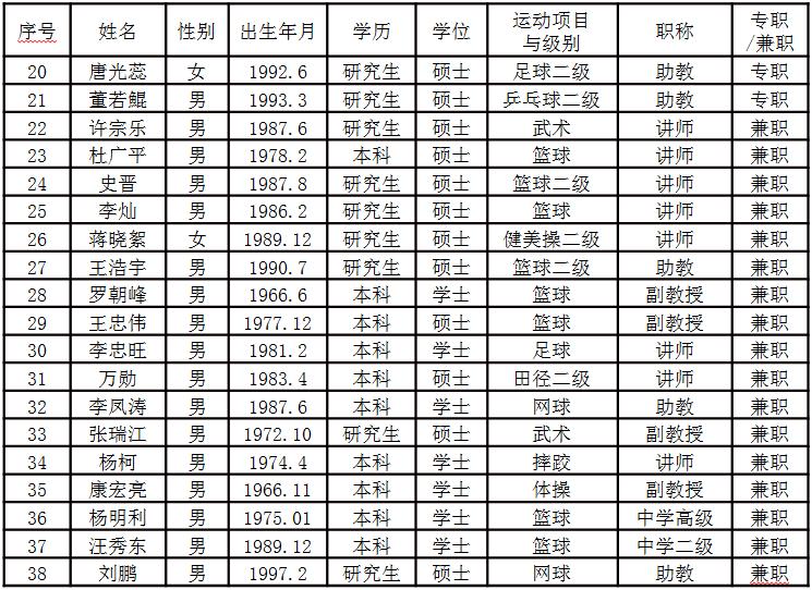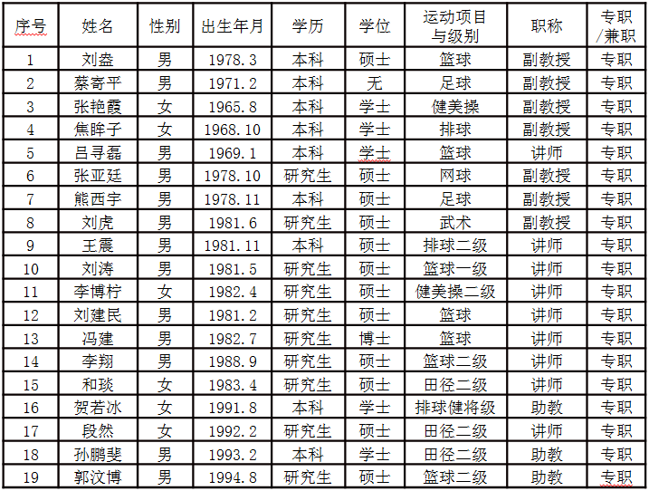 体育部拥有一支专业素质优良、充满活力、业务能力较强、结构合理的师资队伍,现有专任教师32+1人,其中教授1人,副教授9人,讲师15人,助教8人;博士研究生1人,硕士研究生23人,国家级裁判1人,国家一级裁判18人,市级优秀教师2名,校级优秀教师2名,校级优秀教育工作者2名。