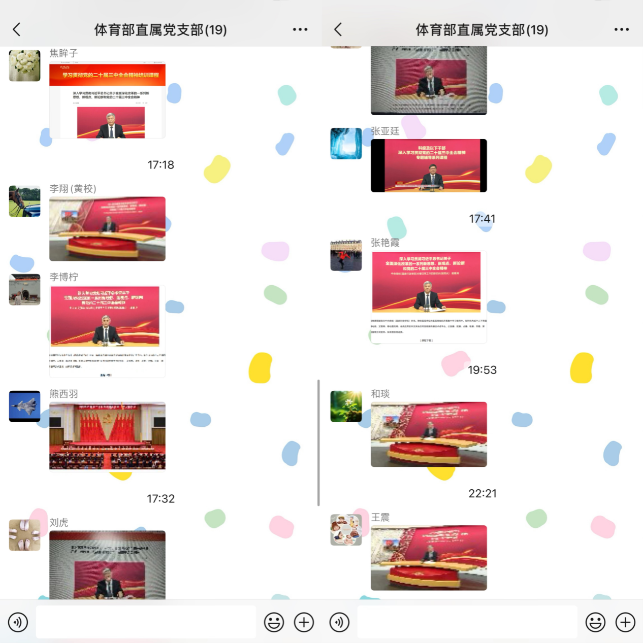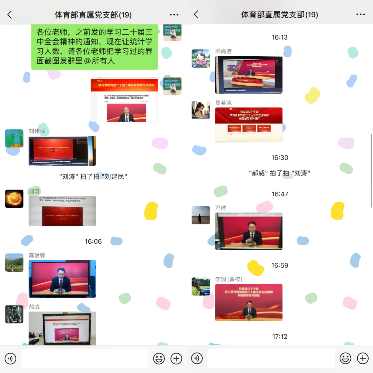 体育部直属党支部党员同志除了开展关于二十届三中全会的现场学习以外,还在在线上进行自学。通过学习贯彻党的二十届三中全会精神,体育部直属党支部进一步坚定了教育现代化并进的信心和决心。未来,体育部将不断提升体育教育教学质量和水平,为培养德智体美劳全面发展的社会主义建设者和接班人贡献体育力量。