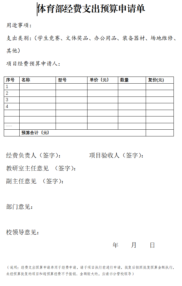体育部经费支出预算申请单
