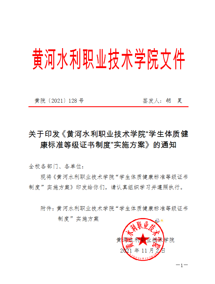 关于印发《黄河水利职业技术学院“学生体质健康标准等级证书制度”实施方案》的通知