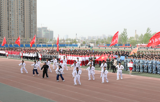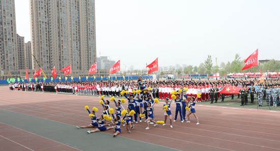 本届运动会开幕式的一大亮点是我校跆拳道协会展示的自创跆拳道团体品势和击破表演。在动感音乐的伴奏下,表演动作变化多样、优美潇洒,充盈着刚健之美,洋溢着青春的气息,诠释了“礼义、廉耻、忍耐、克己、百折不屈”的跆拳道精神,同时也体现了黄河水院学子自强不息、发愤图强的精神。开幕式的又一亮点是校啦啦操队带来的啦啦操表演《我和2035有个约定》。队员们配合默契,动作优美,整齐划一,展示出了青春与活力,充分展现了我校师生蓬勃向上、勇于进取的精神面貌。
