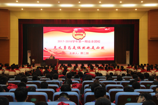 10月15日,我校2017—2018学年第一期业余团校邀请我校2012级优秀毕业生、共青团河南省委常委、全国青联委员邢二朋到我校做题为《见义勇为是偶然也是必然》的讲座。