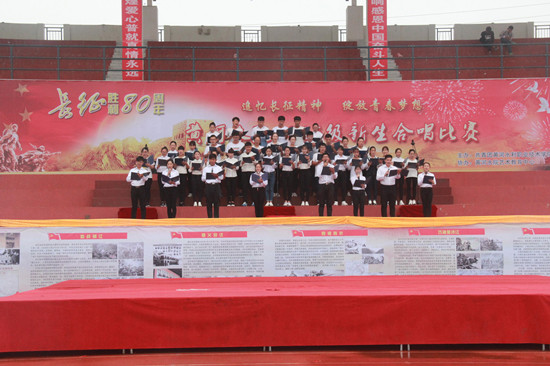 校广播站成员演唱的《长征颂》,再现了红军长征的光辉历程,赞颂了红军在党的领导下创造的惊天动地的英雄壮举,充分表达了亿万人民继承革命传统、创造时代业绩的坚定决心。
