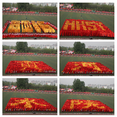 伴随着慷慨激昂的《运动员进行曲》,国旗护卫队、彩旗队和12个院系的代表方队依次走过主席台前,他们整齐的步伐、飒爽的英姿和嘹亮的口号展现出我校学子团结拼搏、昂扬进取的精神风貌。本届运动会开幕式的一大亮点是600人的团体操表演《舞动黄院梦》。表演分坚定信念红旗飘、奋勇向前水院人、“超越式传承”新篇章等三个篇章,分别展示出水院人高尚的爱国情怀、务实的工作作风,团结奋进、勇于开拓的精神和锐意创新、共建伟业的坚定信心。队员们用红黄两种颜色旗帜组成“2016黄河水院”等字样图形,整齐划一、不断变换的造型博得现场阵阵欢呼,迅速将现场氛围推向高潮。