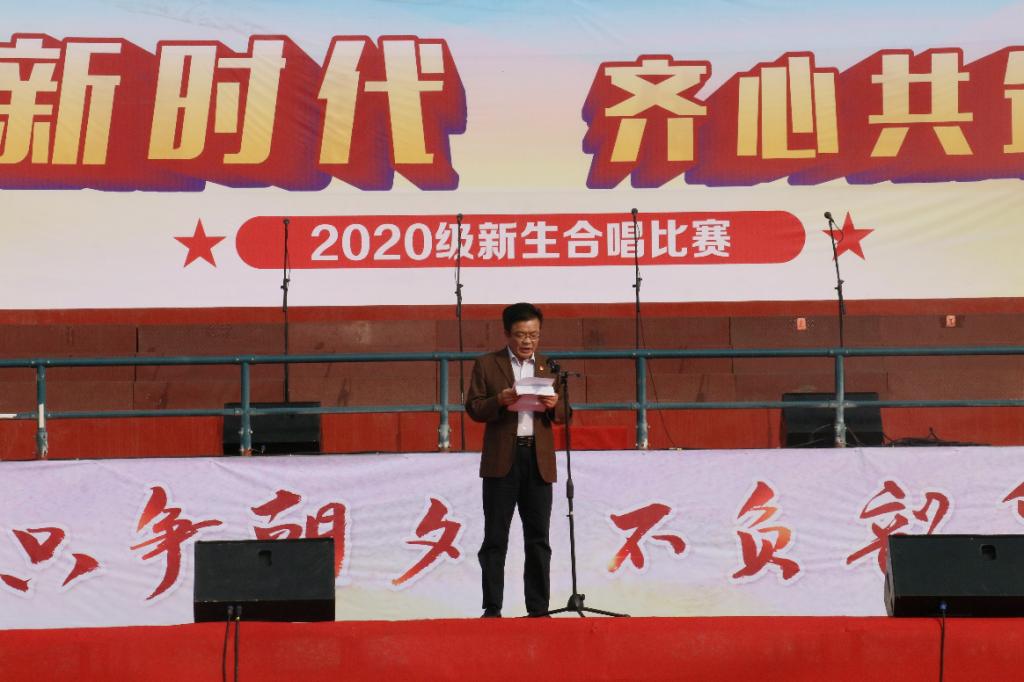 刘卫锋讲话,向合唱比赛筹备期间付出辛勤劳动的全体老师、全体学子表示衷心的感谢。他指出,今年是中国人民志愿军抗美援朝出国作战70周年,我们以爱国歌曲为载体,唱出时代旋律,唱出祖国70多年的壮丽诗篇,唱出对无数革命先烈的崇敬之情。通过开展合唱比赛,引导新时代青年学生以弘扬爱国主义和民族精神为核心,坚定理想信念,培育高尚品格,营造良好的校园红色氛围。他希望学子们继续保持昂扬向上的精神风貌,以优异的成绩书写青春华章。