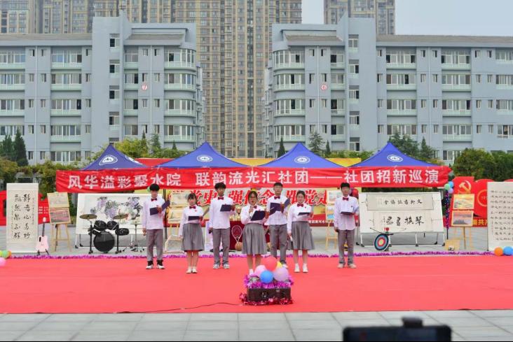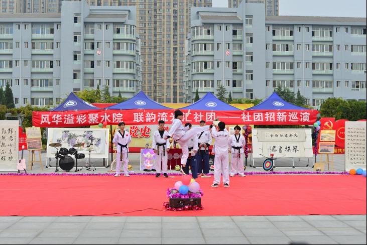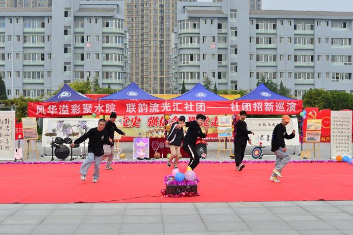 百团齐演聚满园, 水院学子展风采。为了进一步丰富学生社团文化生活,促进社团健康发展,展现我校青年学生朝气蓬勃的良好精神面貌。由校团委主办,社团联合会承办的社团招新巡演活动于10月23日——10月31日在扬帆广场举行。