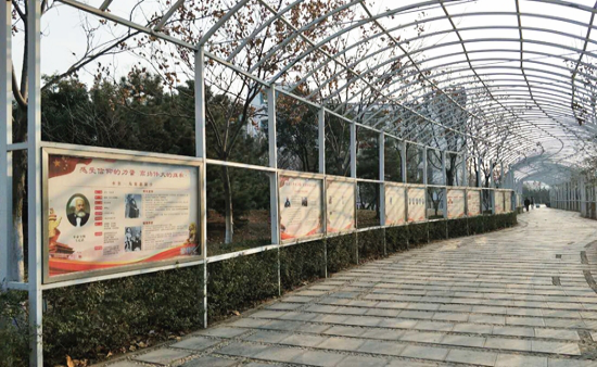 “青马小路”文化长廊位于1号教学楼北侧,是学生上下课、外出的主要通道。文化长廊主要以马克思主义思想、习近平总书记重要讲话论述、党的十九大和团的十八大精神及对社会主义核心价值观、“四个意识”和“四个自信”的解读等为主要内容,共设计制作展板26块,图文并茂、鲜明生动地展现国家、学校近几年发展成果,以培养社会主义合格建设者和接班人为目标,进一步增强思想政治教育的渗透力和感染力,使争做有理想、有本领、有担当的新时代青年的理念在青年学生中入眼、入脑、入心;进一步营造“砥砺前行、奋发向上”的校园文化氛围,激发青年学生的凝聚力、向心力,引领青年学生以实现中华民族伟大复兴为目标不懈奋斗。