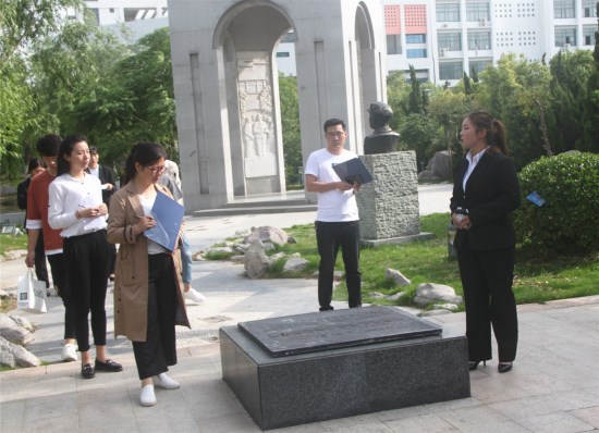 本次大赛分为赛前宣传准备、赛前培训、预赛和决赛等四个阶段。由于本次参赛选手较多,5月20日的初赛分成10个小组同时进行,共有22名选手脱颖而出,进入决赛;在5月22日举行的决赛实地讲解环节,选手们各显神通,表现出了较高的专业素养。在“足迹”文化景观的讲解过程中,王紫艳打破常规,从“铭志碑”经过“国立门”再到“涌泉石录”,带领师生逆向“穿越”我校的辉煌发展历史。