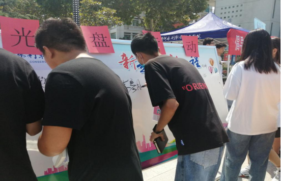 活动中,由校学生会、社联学生组成的“小水滴”文明餐桌志愿者服务队,在思源路拉起了横幅,支起宣传海报,一面向过往的学子宣传“光盘行动”的意义,一面号召学子们在承诺条幅上签下名字,做到将勤俭节约的传统美德内化于心,外化于行。学子们纷纷表示,签下的不仅仅是名字,更是一份承诺,是一份与粮食浪费作斗争、争做光盘行动践行者的承诺。