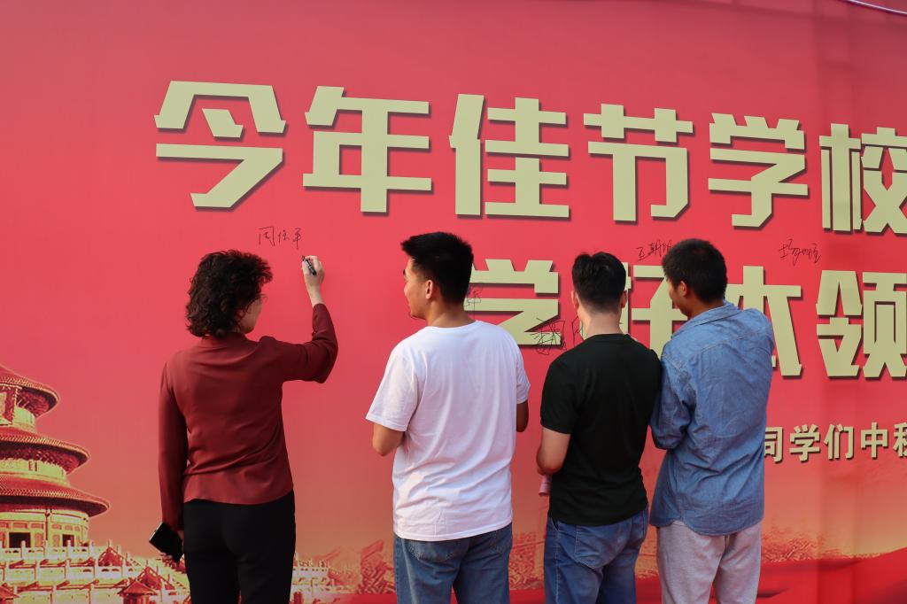 校领导和学子们纷纷在签名墙上签名留念。校领导还来到学生餐厅和学生一起品月饼、谈团圆、谈家国、聊奋斗,共进晚餐。学子们无拘无束地和校领导谈学习、谈生活,整个餐厅欢声笑语、温馨欢畅。学子们纷纷表示今年虽然因为疫情没有回家,但是却度过了一个非常令人难忘的中秋国庆佳节,一定不辜负老师和家长的期望,努力学习专业知识,做一个有道德、有抱负、有情怀、有知识的新时代大学生,用满腔热情报效祖国。