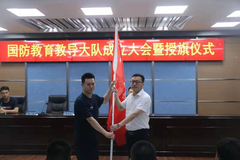 武装部部长任璐宣读了首届国防教育教导大队队员聘任名单,副大队长王震带领全体队员进行入队宣誓,学生处副处长柴杉向国防教育教导大队首任大队长赵兴国授旗。赵兴国作表态发言,承诺将以身作则,保持自己的军人本色,带领好这支队伍,努力为学校发展服务。