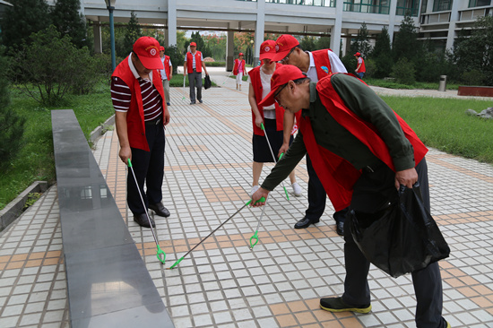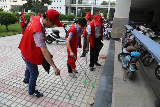 活动中,教师党员志愿者身穿队服,带着小红帽,拿着工具和环保型垃圾袋,来到求知区和思源区及学校主干道,捡拾烟头、塑料碎片、果皮等生活垃圾,有条不紊地进行地毯式卫生清理,整个活动持续了一个多小时。队员们热情高涨,并在活动开展过程中对学生们进行文明礼仪和健康卫生知识教育。