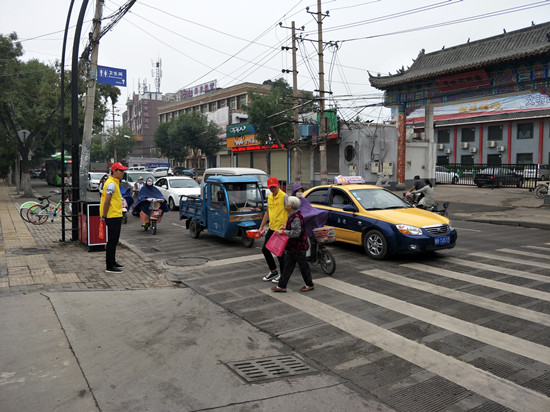 志愿者陪伴老人过马路