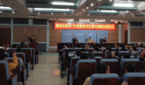 12月13日,由我校学生资助管理中心主办、校诚信自强联合会承办的我校2017年度困难学生棉衣棉被发放仪式在3号实训楼学术报告厅举行,学生处相关负责人、老师及各院系资助助理、受助学生代表等参加活动。