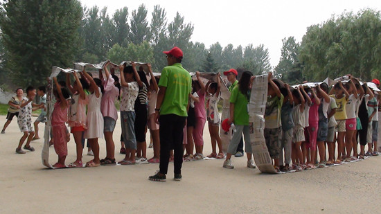11日下午,实践小分队成员与帝丘小学40名留守儿童进行了“钱币抱团”“战略物资”“无敌风火轮”等素质拓展游戏。活动的开展,锻炼了小学生们的通沟与合作能力,提高小学生互助和协作能力,同时,也增进了志愿者和小朋友之间的感情。