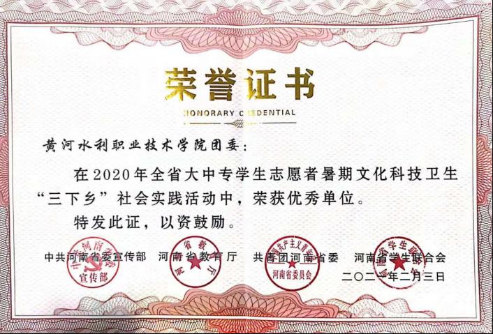 近日,共青团河南省委对在2020年度河南省大中专学生志愿者暑期文化科技卫生“三下乡”社会实践活动总结暨优秀项目展评中表现突出的集体与个人给以通报表彰。我校获“2020年河南省大中专学生志愿者暑期文化科技卫生‘三下乡’社会实践活动优秀单位”荣誉称号,黄河流域生态保护和高质量发展-沿黄九省(区)青年实践小分队、生态保护我先行实践小分队等6支队伍获“省社会实践优秀团队”荣誉称号,张龙飞、马峥等6位实践队员获“省社会实践活动优秀个人”荣誉称号。