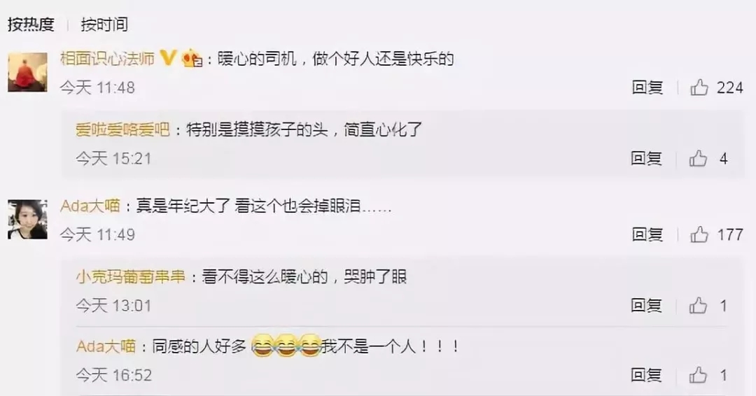 网友说,他们被司机抬手摸孩子的那一下感动了,居然看得掉眼泪。