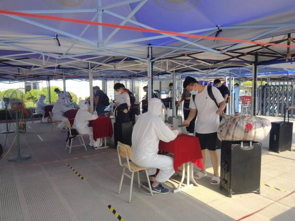 精细防控,有序查验。返校时,学校按照“三必查、两核对、一检测”的程序,组织学生有序入校。学生在学校北门外佩戴口罩、间隔排队、有序入校,工作人员在校门口做好学生行李消杀、体温测量等工作;返校工作人员认真检查学生的健康码及行程码、检查打卡信息、检查“7天4检”核酸检测报告,做到“三必查”;运用智慧校园,提前将专升本考生考试信息录入学校门禁系统,一站式完成入校和考生信息验证核对工作,减少校内人员接触,做到“两核对”。入校后,在志愿者热心引导下,每一个返校学生进行入校核酸检测,做到“一检测”,学生完成入校规定流程,整个返校报到现场平稳有序。