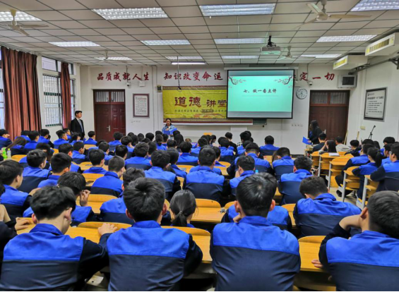 本次道德讲堂紧紧围绕“讲一个故事”、“看一部短片”、“学一点儿礼仪”、“诵一段经典”,组织师生诵读《青年中国说》、“作一个承诺”、“唱一首歌曲”、“作一番点评”、“送一份吉祥”八个环节展开,通过丰富多彩的学习活动引导全体同学奋发图强,勇担青春重任。