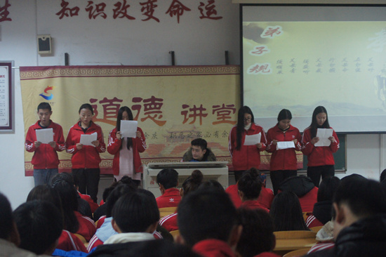 本次道德讲堂围绕“孝”字展开,分为八个环节:看一部短片、讲一个故事、唱一首歌曲、诵一段经典、学一点礼仪、做一个承诺、做一番点评、送一份吉祥。