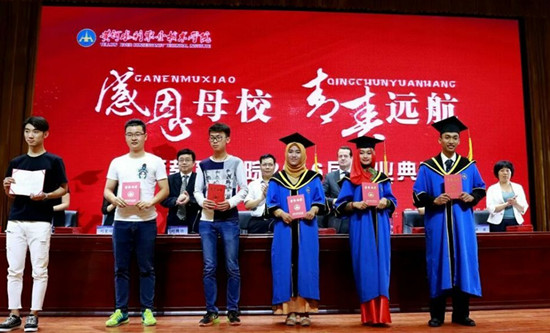 刘国际校长为毕业留学生颁发了毕业证书。出席活动的领导为获得省级、校级“优秀毕业生”荣誉称号的毕业生颁发了荣誉证书。