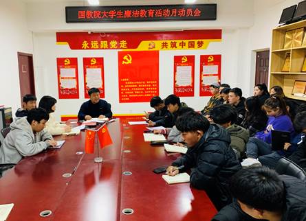 2019年11月21日,国际教育学院党总支副书记王成伟组织全体学生干部在SY5503召开了廉洁教育专题讲座。王书记廉洁教育讲座从中国共产党的根本宗旨以及实现中华民族伟大复兴的奋斗目标,深刻阐明了大学生开展廉洁自律建设的重要性,深入分析我国当前大学生廉洁自律建设现状,对我校大学生廉洁自律教育现状进行了全面深入的剖析,他对我校大学生廉洁自律提出了四点希望和要求:一是加强思想政治教育,做一名理想信念坚定的人;二是提高自我教育和廉洁能力,做一名具有高尚道德情操的人;三是深入社会实践和廉洁锻炼,做一名有责任担当的人;四是弘扬先进典型,做一名德才兼备的人。王书记从加强廉洁教育的必要性,廉洁教育的具体内容,廉洁教育需要着手解决的问题进行了阐述。