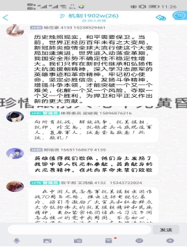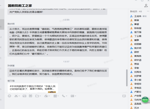 我院教师通过教工之家企业微信群开展热议讨论,教师党员刘梦媛说:“中华民族是爱好和平的民族,我们珍惜和平,热爱和平。今天我们的幸福生活来之不易,我们会坚决维护,不忘国耻,振兴中华,也向伟大的197653名烈士们致敬,铭记英雄。”