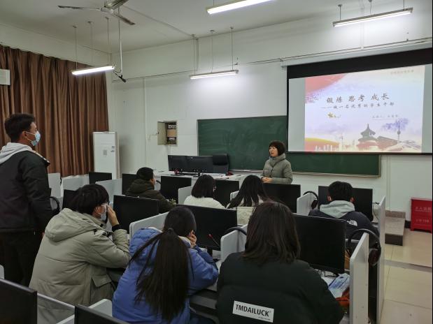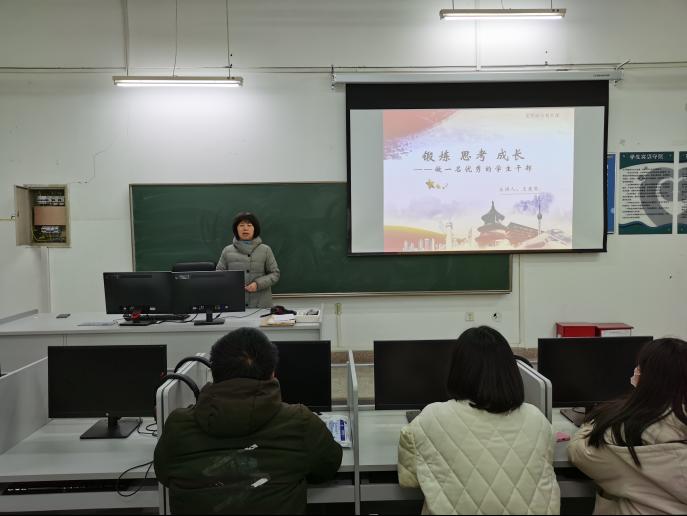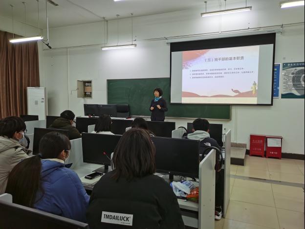 12月23日晚,国际教育学院院长王爱琴在JX7410教室为2020级学生干部上了一堂题为“锻炼 思考 成长——做一名优秀的学生干部”的思想政治教育课,学院分团委书记曹睿、辅导员老师李小毅、赵晋萱出席,2020级全体学生干部参与。