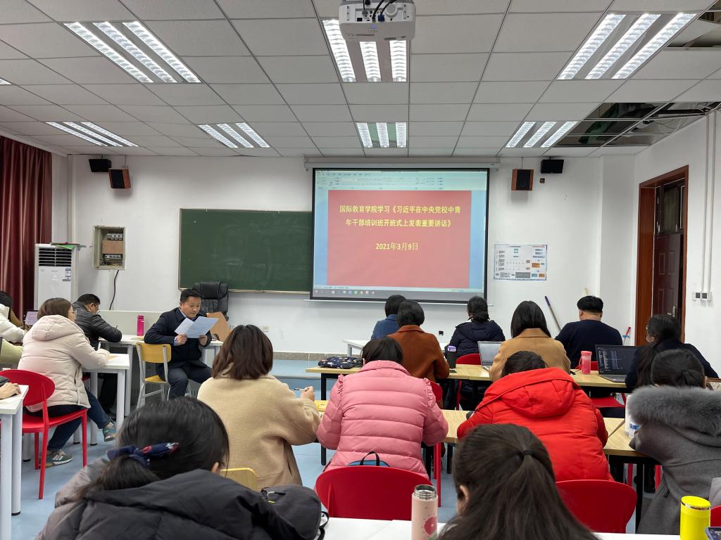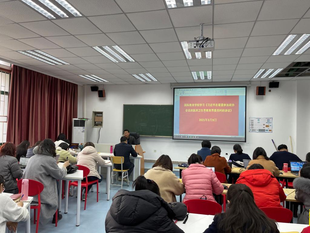 3月9日下午,国际教育学院在JX7401会议室召开了政治理论学习会,组织全体教职工学习《习近平总书记在党史学习教育动员大会上的讲话》《习近平在中央党校(国家行政学院)中青年干部培训班开班式上发表重要讲话》及《习近平在看望参加政协会议的医药卫生界教育界委员时的讲话》精神。会议由院党总支书记楚万强主持。