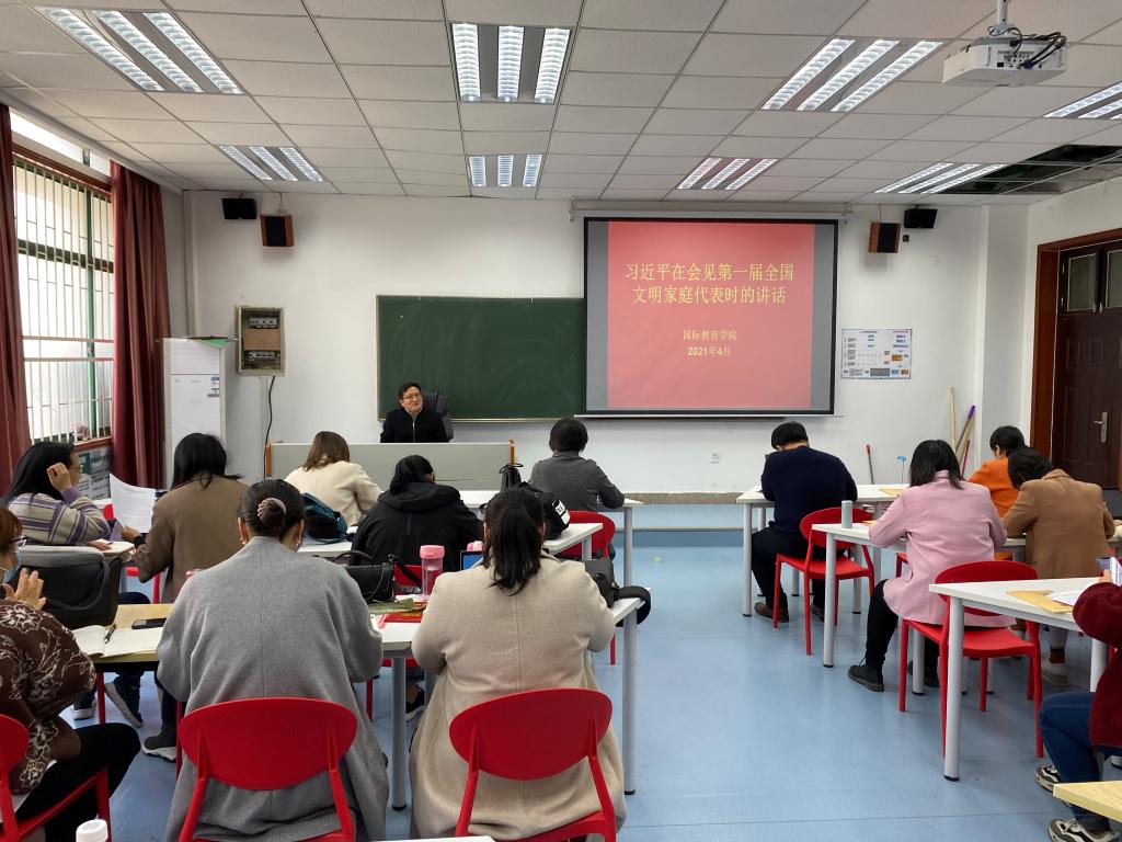 4月13日下午,国际教育学院在JX7401会议室召开了政治理论学习会,组织全体教职工学习了《习近平在会见第一届全国文明家庭代表时的讲话》及《关于深化拓展“传家训、立家规、扬家风”活动的通知》精神。会议由院党总支书记楚万强主持。
