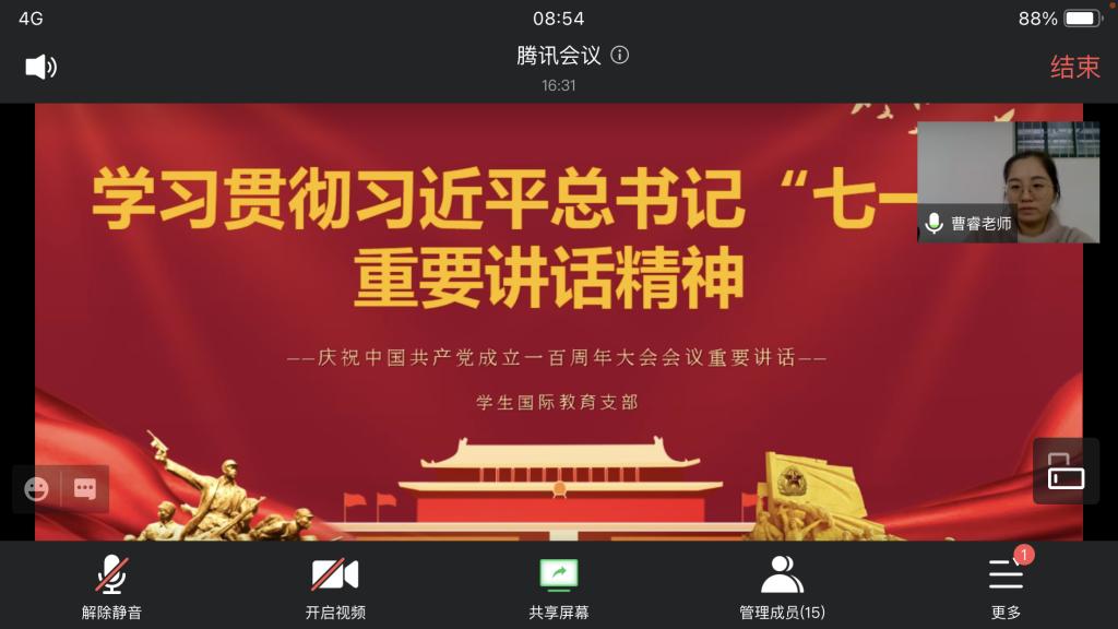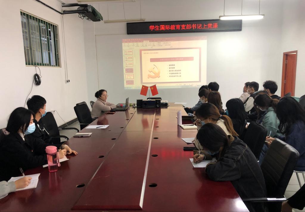 2021年10月16日上午,学生国际教育支部在JX7408会议室召开政治理论学习会,支部书记曹睿为全体学生党员上“学习贯彻习近平总书记‘七一’重要讲话精神”专题党课。学院全体在校学生党员参加,其余党员通过腾讯会议直播平台线上参加党课学习。