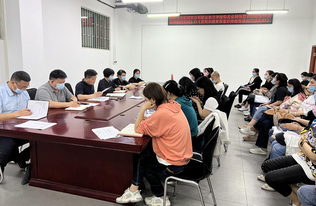 4月26日下午,国际教育学院在JX7408会议室召开学习意识形态专题会议,重点学习《中共黄河水利职业技术学院委员会网络意识形态工作责任制实施细则》和《黄河水利职业技术学院党委意识形态工作责任制实施细则》文件内容和精神,全院教职工参加。会议由党总支书记楚万强主持。