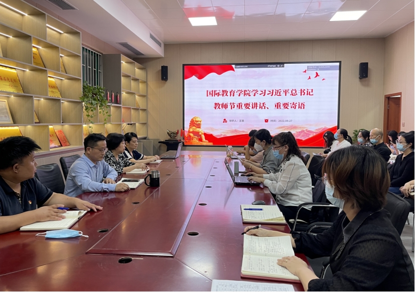 首先,教工国际教育支部宣传委员王慧领学了习近平总书记从2013年9月至今,在不同场合,不同时间节点,不同地点关于教师节发表的重要讲话和重要寄语。