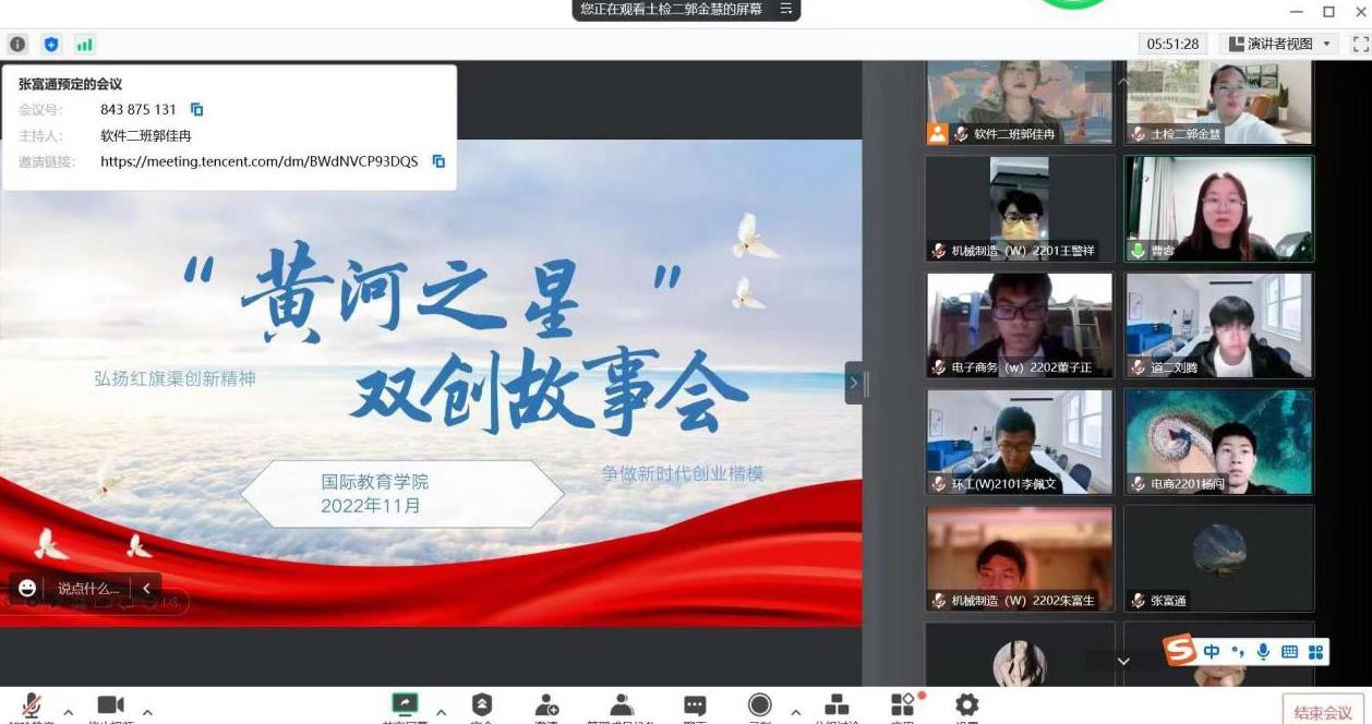为深入学习贯彻党的二十大精神,弘扬红旗渠创新精神,11月8日下午,国际教育学院在线上腾讯会议举行了“黄河之星”双创故事会初赛。学院分团委书记曹睿出席,50多名选手积极参与故事会比赛。