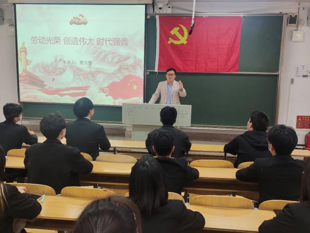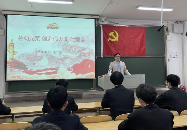 5月14日上午,国际教育学院党总支书记楚万强在教学楼6102为学生上“让劳动光荣,创造伟大”成为时代强音为主题思政课。