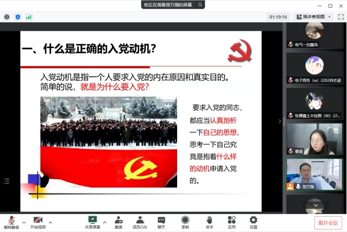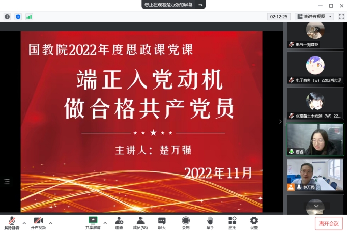 11月29日下午,国际教育学院在线上开展“端正入党动机,做合格共产党员” 的专题思政党课,党总支书记楚万强主讲,全体入党积极分子参加了此次党课培训。