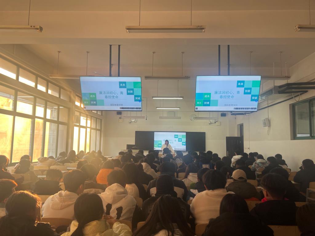 为进一步营造风清气正的文化氛围,提升学生的廉洁自律意识,2023年11月16日下午,国际教育学院兼职纪检员黄海燕在教学楼2401教室为2022级、2023级学生会干部,入党积极分子及各班级班委上“廉洁润初心,青春担使命”廉政党课。