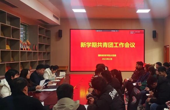 2023年2月21日,国际教育学院在JX7408会议室召开新学期共青团工作会,院党总支副书记王成伟、分团委书记曹睿、各年级团总支书记、辅导员以及学生组织团干部参加会议。会议由院分团委书记曹睿主持。