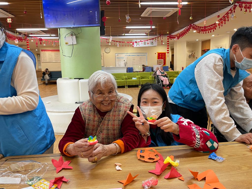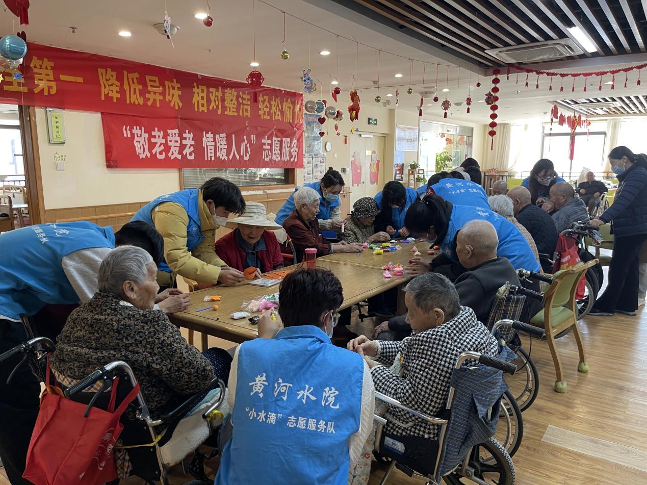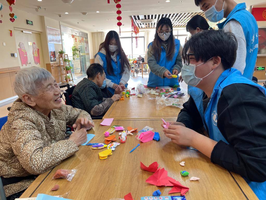 演出结束后,志愿者们与爷爷奶奶们一起捏泥人,做手工折纸。志愿者们与老人们聊天拉家常。老人们聊着当年的岁月,谈论着现在的幸福生活,志愿者们亲切地拉着爷爷奶奶们的手,认真倾听老人们的讲述。