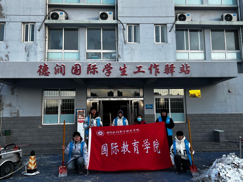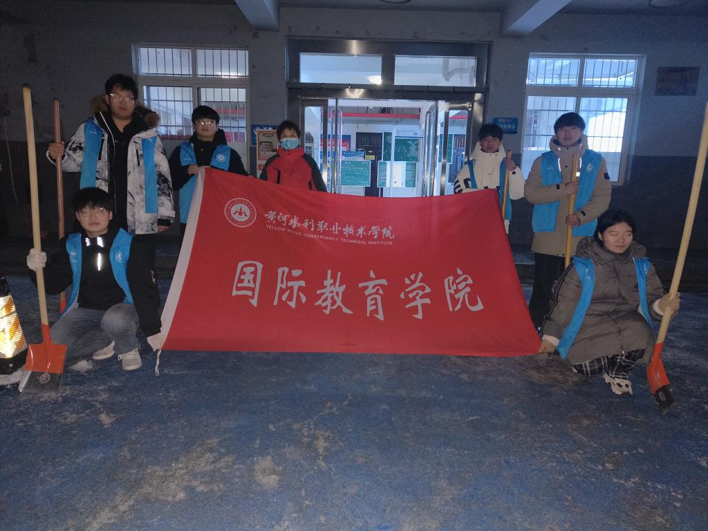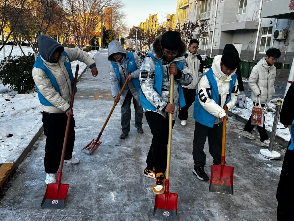 腊月寒冬,大雪纷飞,厚厚的积雪覆盖着整个校园。2023年12月11日-17日,为方便师生出行,国际教育学院组织志愿服务队在校园内开展清扫积雪志愿服务活动。志愿者们拿着铁锹在教学楼东侧、17号宿舍楼周边的大路和人行道上清理积雪。因天气寒冷,路上积雪已被冻成了厚厚的冰层,志愿者们不顾严寒,齐心清理路面积雪和冰块,为师生们开出了一条条道路。