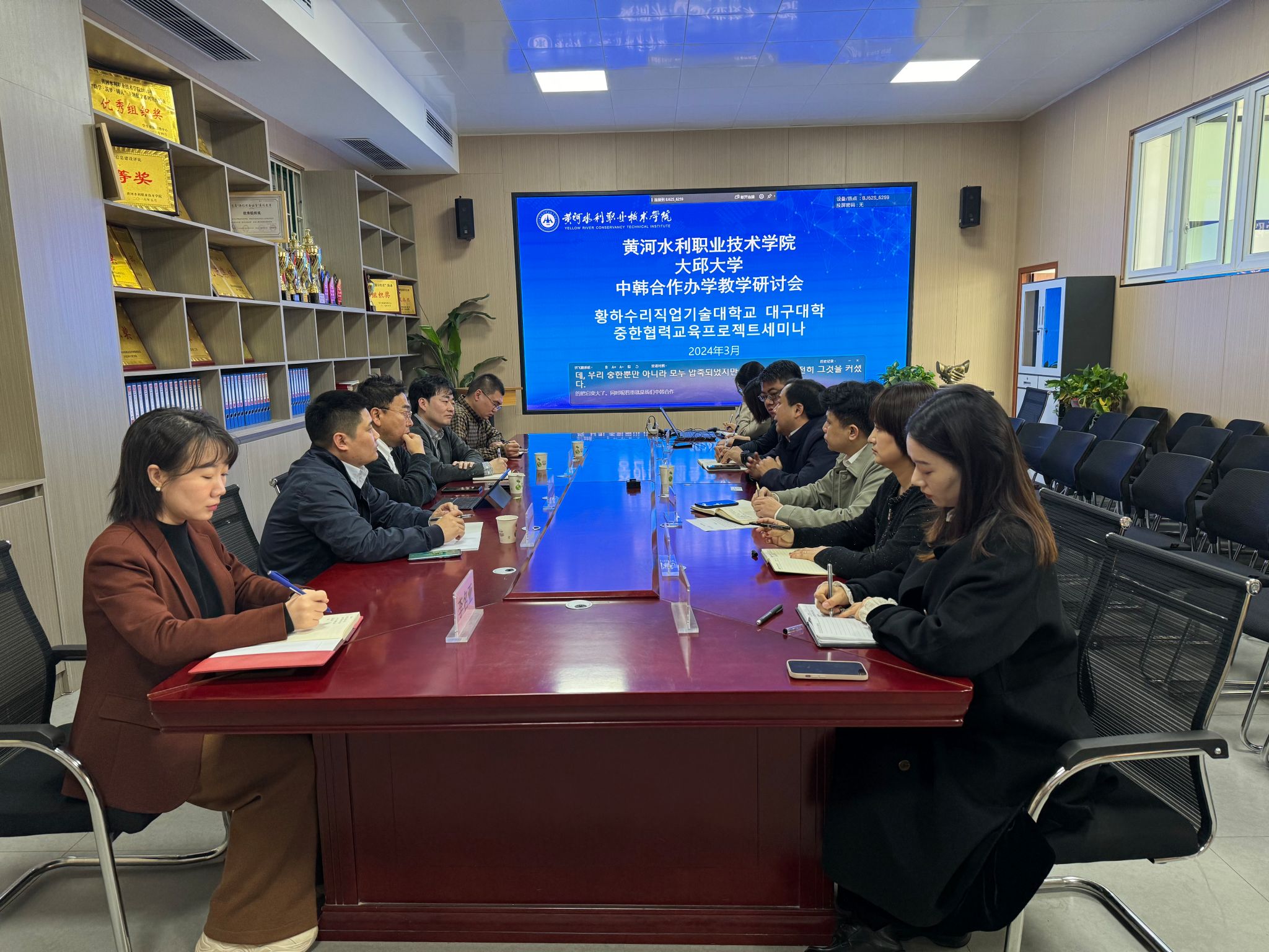 3月14日上午,国际教育学院在JX7408举办“黄河水利职业技术学院与大邱大学中韩合作办学教学研讨会”,河南省外事侨务服务中心负责人,韩国大邱大学国际处部长李昇熙、国际处主任孔大锡,国际教育学院领导班子及韩语教学团队教师代表参加了会议。