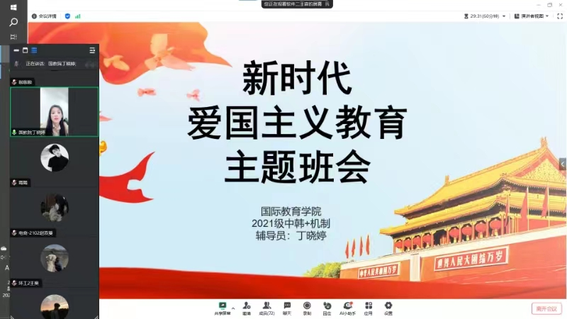 各年级辅导员通过线上线下形式召开了“弘扬爱国情,共筑中国梦”主题班会,积极动员、精心组织,确保了此次爱国主义教育系列活动全覆盖。班会主要围绕“平常小事也是爱国、爱国主义的传统、爱国情怀的基本逻辑”,并从国家层面、社会层面与个人层面讲解了新时代爱国主义教育的意义与内涵所在。辅导员老师与同学们进行互动,引导同学们正确理解爱国精神的内涵所在,把握新时代爱国主义鲜明特质,增强爱国主义情感。同学们认识到,爱国主义是中华民族历经磨难而不衰、饱经沧桑而不败的精神支柱,是实现中华民族伟大复兴的强大动力。在新时代,我们要积极践行爱国主义精神,为国家的繁荣富强贡献自己的力量。同学们围绕新时代如何践行爱国主义展开了热烈讨论。