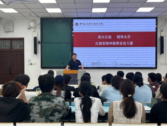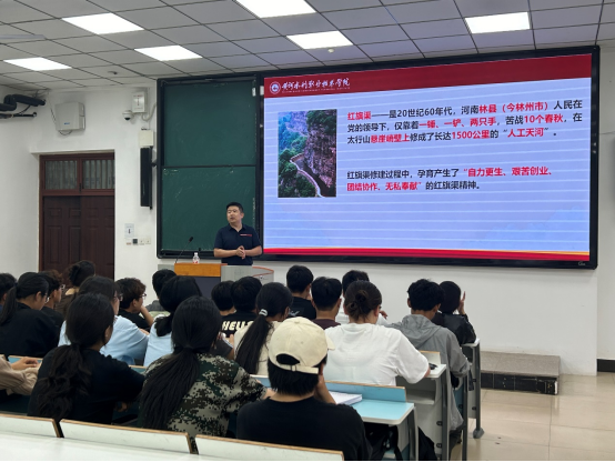 2024年9月27日,国际教育学院党总支副书记赵巍在JX6101教室,以“渠水长流 精神永存 红旗渠精神凝聚奋进力量”为主题,为2024级新生讲授开学第一课。