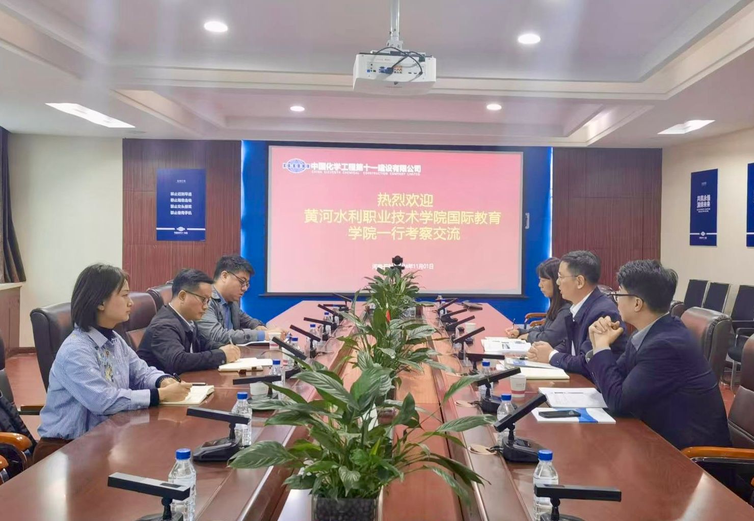 11月1日,国际教育学院党总支书记楚万强、院长卫宗超、校企合作办主任沈冰赴中国化学工程第十一建设有限公司考察调研。人力资源部部长娄战士、项目管理部副部长晋普、人力资源部招聘培训经理李楠参加座谈,双方就开展企业工程技术人员语言培训、学生岗位实习、公司招聘以及国际化人才培养基地共建等事项进行深入交流。