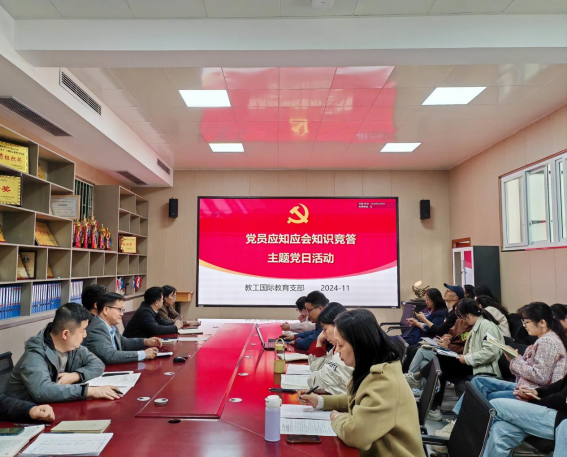 2024年11月5日,国际教育学院党总支在JX7408会议室成功举办了以党员应知应会知识竞答为主题的党日活动。本次活动由教工党支部书记张科峰主持,并通过随机抽选的方式对党员教师进行了党建基础知识的测试,内容包括“两个维护”“四个自信”以及“四有好老师”等党建知识。