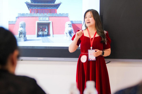 我校选手陈嘉郡在比赛中做《我来到了这片热土》主题演讲