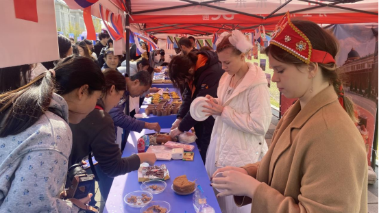 本次活动中,各高校精心打造的文化交流展区百花齐放。我校结合留学生民族特色,重点打造俄罗斯美食展区,精心筹备了俄式蜂蜜蛋糕、大列巴、格瓦斯等极具俄罗斯地域特色的饮食。醇厚的口感、独特的风味搭配深厚的文化底蕴,迅速吸引了大批参会者驻足品尝、交流咨询。展区内人头攒动,中外师生围绕美食文化热烈互动,成为文化节上极具特色的味蕾盛宴。